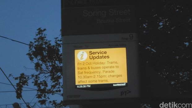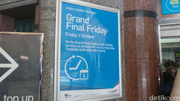 Pemberitahuan tentang pelayanan trem pada hari libur publik jelang Grand Final AFL (Foto: Nograhany WK)