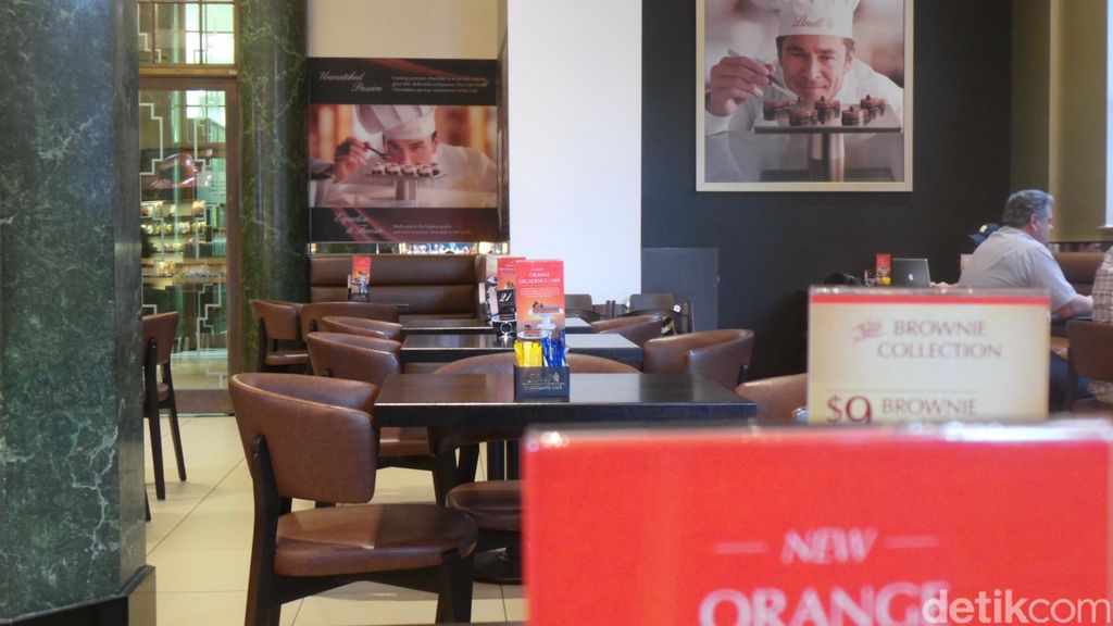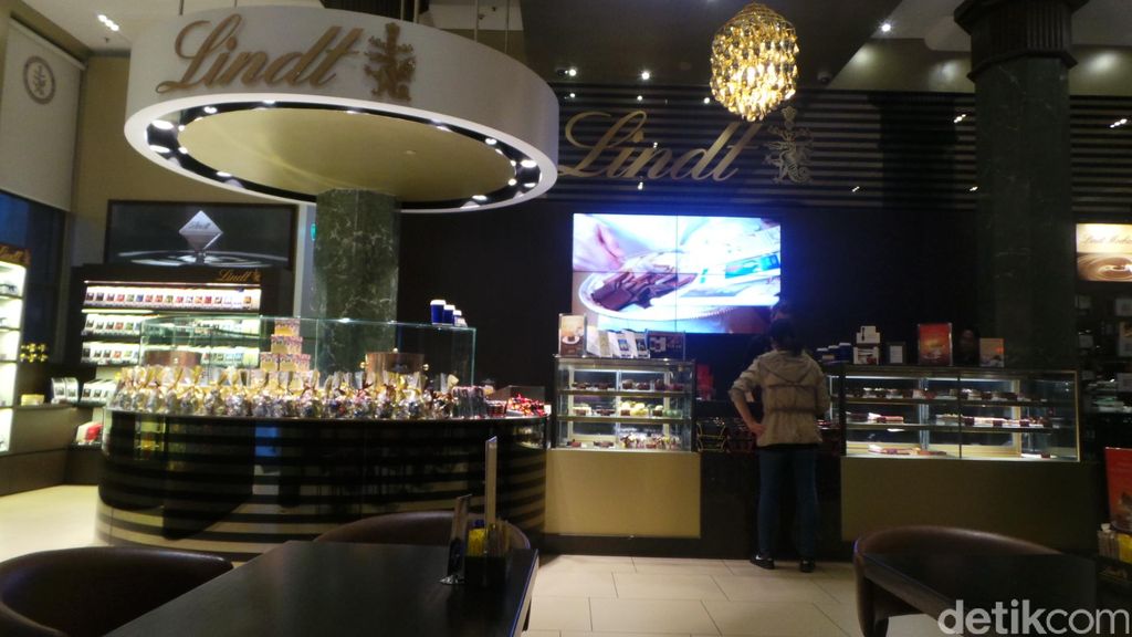 Di luar ada marmer berwarna terakota dengan tulisan latin Lindt dan jendela-jendela tinggi dengan tulisan Lindt Chocolate Cafe. Kami masuk ke dalam dan langsung melihat buku menu.