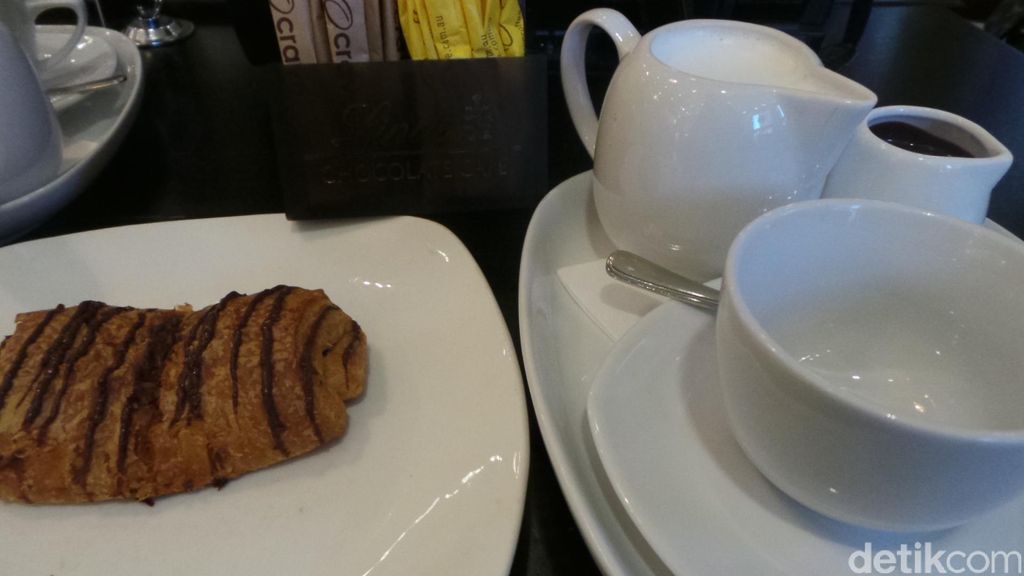 Pesanan datang. Ada susu dalam teko kecil, kemudian cokelat yang sudah dilelehkan dan cangkir, semuanya dari porselen putih. Meminumnya harus mencampurkan kedua cairan itu. Rasanya, nikmat! "Lindt Pain Au Chocolate" yang saya pesan adalah roti croisant berisi cokelat dan berhiaskan cokelat di atasnya. Croisant-nya renyah.