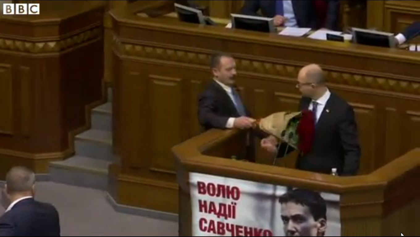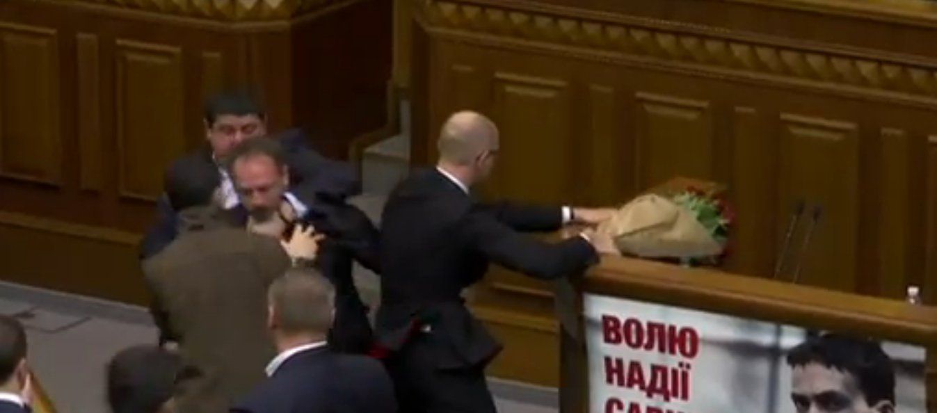 Dalam video yang dilansir BBC, edisi 11 Desember 2015, PM Yatseniuk yang sedang berpidato dan sedang mempertahankan kebijakan pemerintah tiba-tiba didatangi oleh anggota parlemen yang diketahui bernama Oleh Barna.