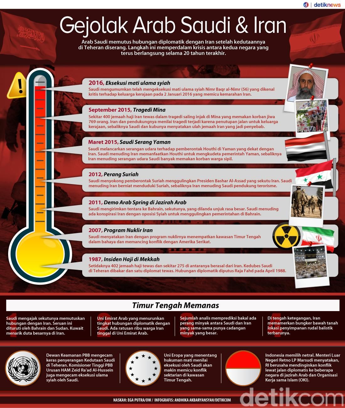 Ketegangan antara Iran dan Saudi memuncak sejak otoritas Saudi mengeksekusi mati ulama terkemuka Syiah, Nimr al-Nimr pada Sabtu, 2 Januari lalu. Ulama Nimr dikenal sebagai tokoh vokal penentang pemerintah Saudi, yang kerap menyerukan hak-hak yang lebih besar bagi warga minoritas Syiah di Saudi.
