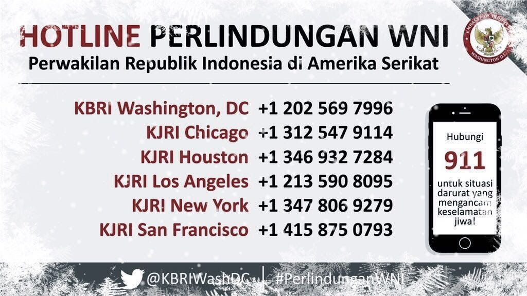Warga Indonesia di AS yang menghadapi situasi darurat dapat menghubungi Perwakilan-perwakilan RI di AS melalui nomor hotline sebagaimana tertera pada gambar di atas untuk memperoleh pertolongan.
