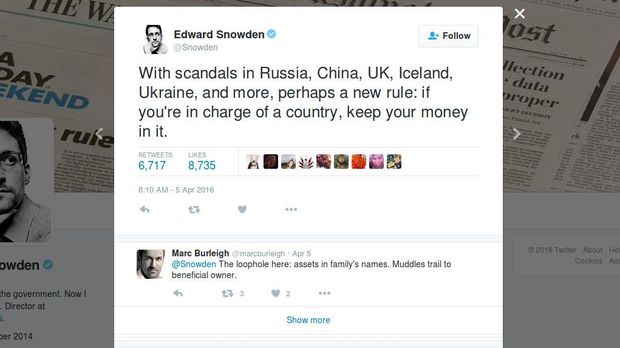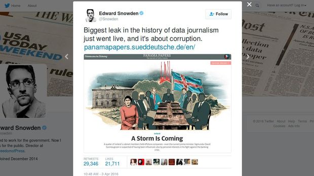 "Dengan skandal di Rusia, China, Inggris, Islandia, Ukraina dan banyak lagi, mungkin harus ada aturan baru: jika Anda bertanggung jawab atas suatu negara, jaga uang Anda tetap di dalam," sindir Snowden melalui akun Twitter resmi miliknya @Snowden.