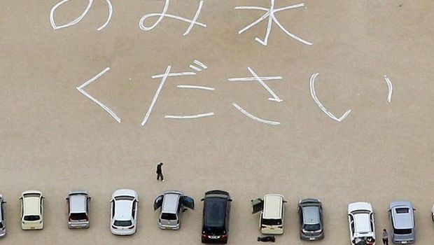 Kesulitan seperti ini juga tampak dari sebuah foto yang diambil dari udara. Dalam gambar tersebut menunjukkan para pengungsi butuh air minum. Hal tersebut disampaikannya melalui tulisan yang ditulis dengan kapur di tengah mobil-mobil yang terparkir di halaman sekolah.