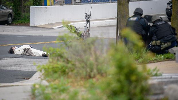 Polisi setempat kemudian mengerahkan tim penjinak bom, tim SWAT dan ahli perunding ke lokasi. Namun pria itu tetap tidak kooperatif. Disebutkan Smith, setidaknya tiga polisi melepas tembakan ke arah pria itu ketika dia keluar dari gedung dan berjalan mendekati polisi. Pria yang identitasnya belum dirilis ke publik itu, mengalami luka tembak namun tetap sadarkan diri ketika dibawa ke rumah sakit. Belum ada dakwaan pidana yang dijeratkan kepadanya.