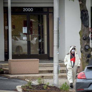 Pria berpakaian panda berjalan keluar gedung televisi FOX45 (REUTERS/Bryan Woolston) |