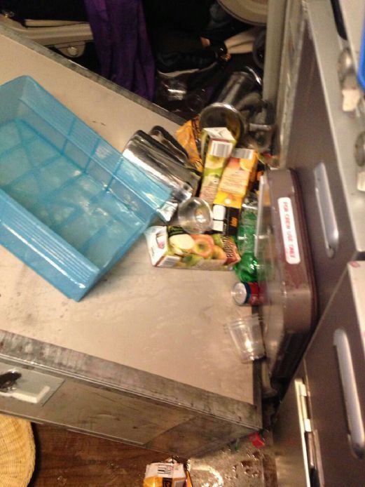 Makanan dan minuman yang ada di kereta makanan itu tumpah dan berserakan ke lantai. Situasinya sungguh kacau seperti pesawat terguncang hebat.