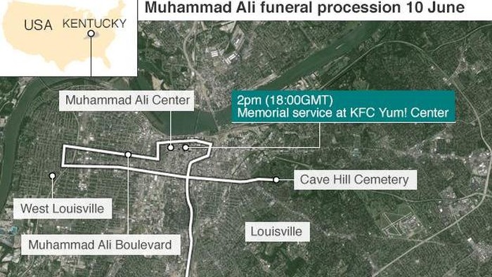 Seperti dilansir media BBC, Jumat (10/6/2016), prosesi iring-iringan mobil tersebut akan dimulai pada Jumat (10/6) pukul 09.00 waktu setempat. Iring-iringan pengantar jenazah Ali akan melewati rumah masa kecilnya yang sederhana di Grand Avenue, Muhammad Ali Center, kemudian Center for African American Heritage, lalu menyusuri jalanan Muhammad Ali Boulevard. Prosesi tersebut diperkirakan akan berlangsung sekitar 90 menit.