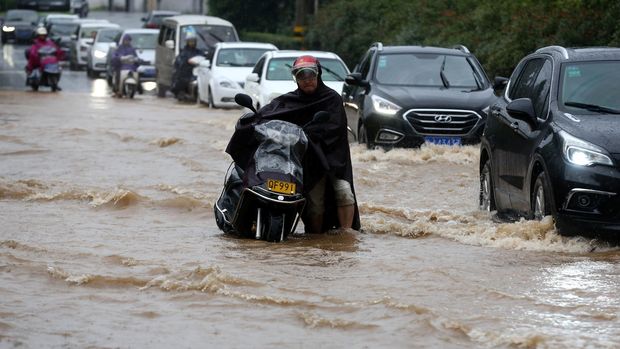Pria bermotor menyeberang banjir di Provinsi Anhui (REUTERS/Stringer)