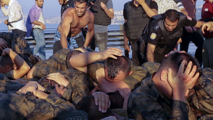 Berbagai gambar yang beredar di media sosial menunjukkan, para tentara yang ditahan dilucuti pakaiannya hingga bertelanjang dada. Namun ada juga tentara yang hanya mengenakan celana dalam. Mereka diborgol dan dibaringkan bersama di dalam arena olahraga di Ankara, tempat mereka ditahan.