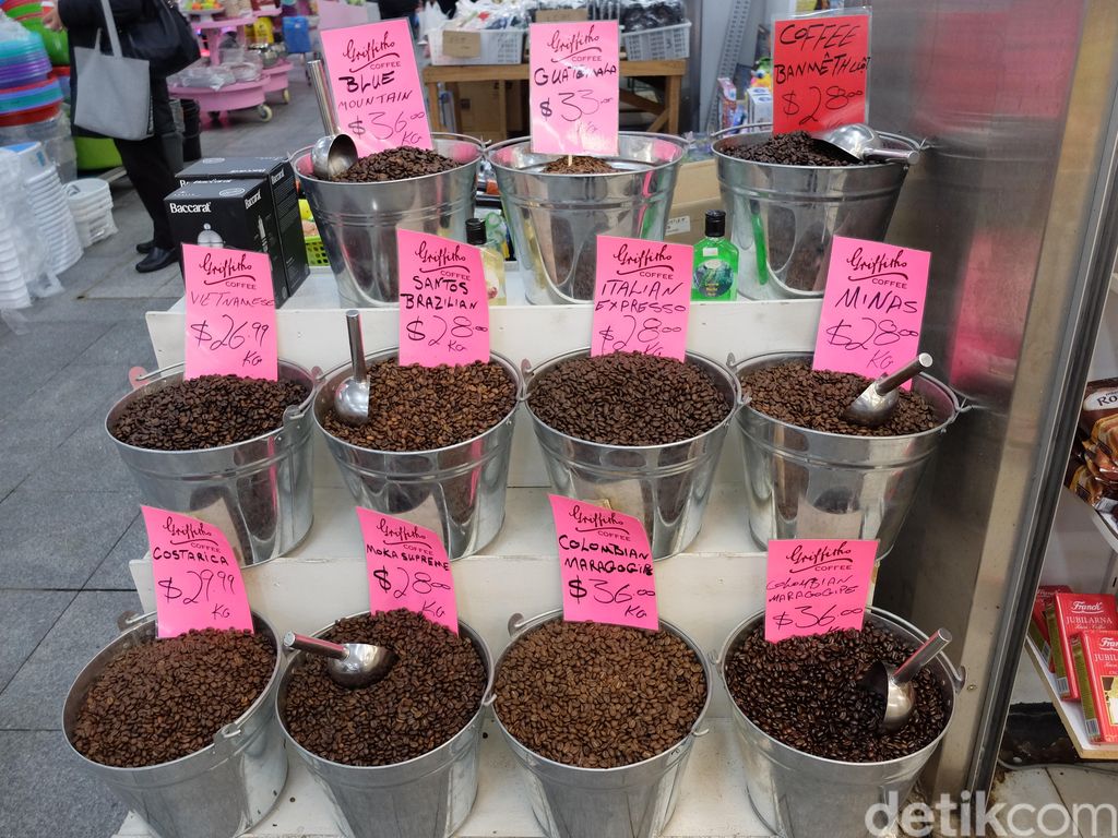 Aneka biji kopi panggang siap giling dari berbagai negara di Footscray Market Melbourne (Foto: Ikhwanul Khabibi/detikcom)
