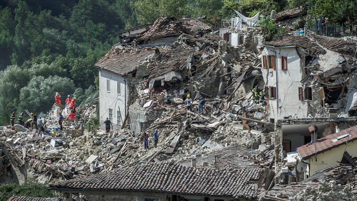 Di kota kecil Amatrice yang rusak parah diguncang gempa, banyak warga yang belum ditemukan namun tidak diketahui pasti jumlahnya. Upaya pencarian pun terus dilakukan dengan anjing-anjing pelacak dan para petugas penyelamat terus menyisir dan menggali puing-puing.