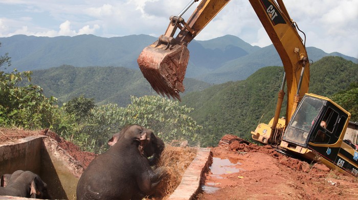 Pada Selasa (11/10) waktu setempat, petugas penyelamat membawa masuk sebuah ekskavator untuk merobohkan tembok waduk itu agar gajah-gajah yang terjebak bisa keluar.