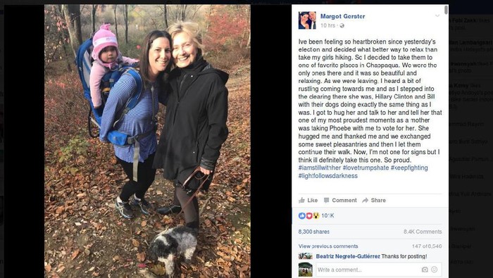 Warga New York bernama Margot Gerster tak sengaja bertemu dengan Hillary saat mendaki pada Kamis (10/11) waktu setempat, atau sehari setelah Hillary mengakui kekalahan dari Trump. Gerster menyebut, Hillary terlihat damai dan anggun.