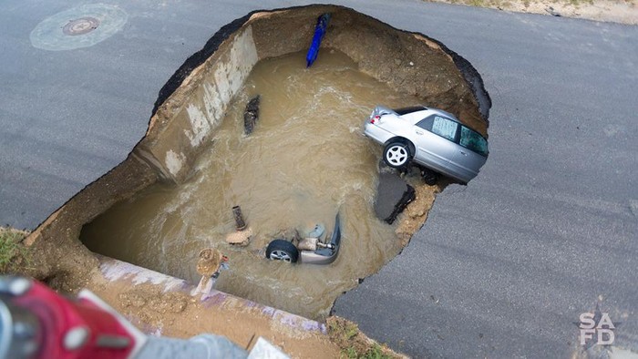 Seperti dilansir news.com.au, Selasa (6/12/2016), otoritas setempat melaporkan sinkhole ini muncul pada Minggu (4/12) malam sekitar pukul 07.30 waktu setempat di San Antonio. Sinkhole raksasa itu menelan dua mobil yang posisinya terguling dan nyaris tenggelam sepenuhnya di dalam air yang memenuhi lubang itu.