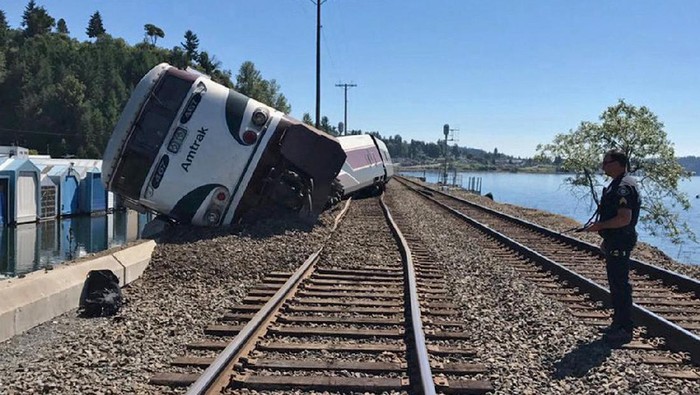Dituturkan pihak Amtrak, rangkaian kereta Amtrak Cascades 506, anjlok dari rel di kawasan Chambers Bay Bridge di Steilacom, Washington, sebelah selatan Tacoma. Rangkaian kereta itu melayani rute antara Vancouver, British Columbia dengan Eugene, Oregon.