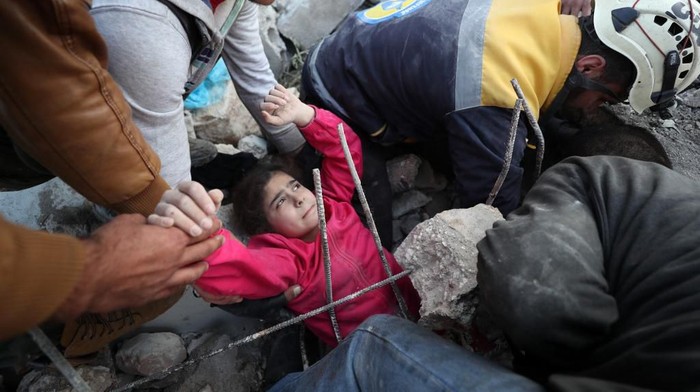 Seperti dilansir CNN, Sabtu (21/12/2019), dalam penyelamatan yang terekam kamera ini, terlihat bocah perempuan yang memakai baju merah muda itu memegangi batang logam bengkok yang mencuat dari reruntuhan bangunan. Kaki bocah ini terjepit plafon bangunan yang ambruk.