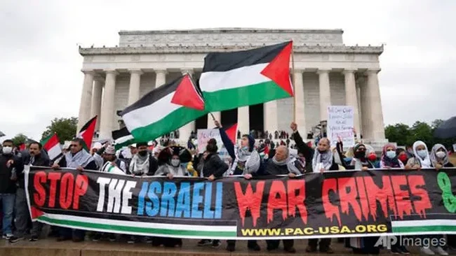Para demonstrasi memenuhi Lincoln Memorial pada Sabtu (29/5). Mereka memegang bendera Palestina sambil menyuarakan pemerintah AS untuk menghentikan bentuk bantuan kepada Israel.