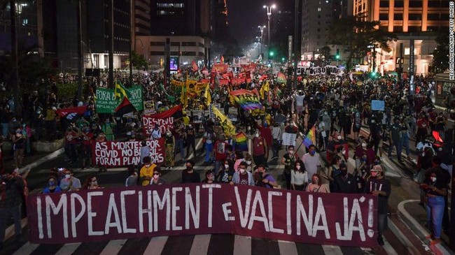 Masyarakat Brasil memadati seluruh negeri guna melakukan protes atas cara penanganan pandemi Presiden Brasil, Jair Bolsonaro. Aksi protes berlangsung setidaknya di 16 kota sambil menuntut Bolsonaro mundur dari jabatannya.