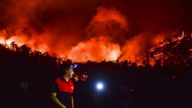 Seperti dilansir AFP, Kamis (5/8/2021), sebuah tim AFP melihat para petugas pemadam kebakaran dan polisi setempat menyelamatkan diri dari pembangkit listrik berusia 35 tahun bernama Kemerkoy yang terletak di area Mugla, dengan kobaran api melalap area perbukitan sekitarnya.