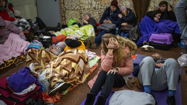 Mereka terdiri dari orang dewasa, puluhan anak-anak hingga para wanita. Kamis (24/2) malam mereka harus tidur di stasiun kereta demi menyelamatkan nyawa dari serangan Rusia.