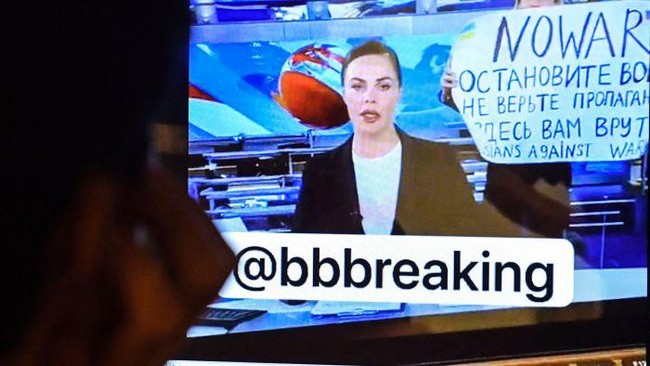 Seorang pegawai stasiun televisi Rusia menerobos studio saat berlangsung siaran berita malam yang paling banyak ditonton di Rusia. Di tengah siaran langsung, wanita itu tiba-tiba muncul membawa poster bertuliskan "No War" dan mengutuk aksi militer Moskow di Ukraina.