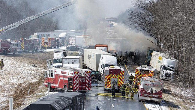Dilansir dari Associated Press, kecelakaan itu terjadi pada Senin (29/3/2022) waktu setempat, saat terjadi badai salju. Kejadian di Interstate 81 tertangkap dalam video yang diposting di media sosial.