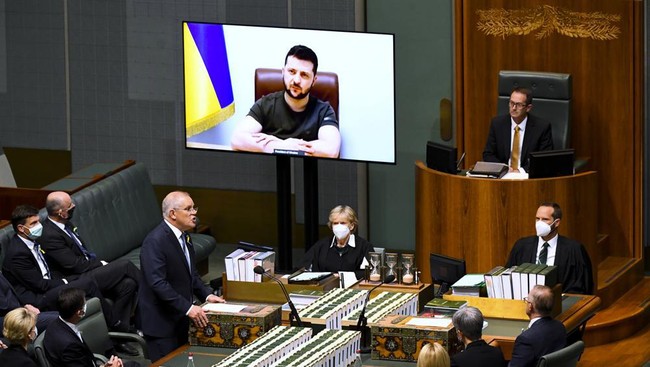 Dalam pidatonya via tautan video di hadapan parlemen Australia pada Kamis (31/3) waktu setempat, Zelensky secara terbuka meminta bantuan kendaraan lapis baja dari Australia.