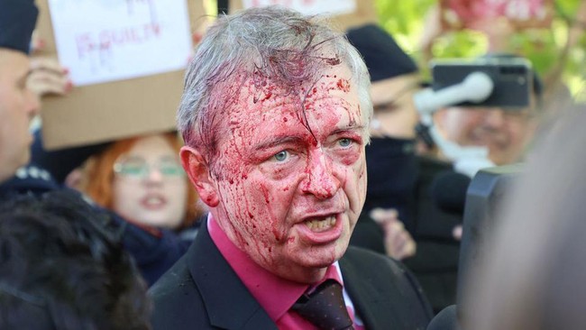 Duta Besar Rusia untuk Polandia, Sergey Andreev, disiram cairan merah oleh para demonstran yang memprotes perang di Ukraina. Insiden terjadi saat Andreev meletakkan karangan bunga di Makam Militer Soviet di Warsawa dalam rangka memperingati 77 tahun kemenangan atas Nazi Jerman dalam Perang Dunia II.
