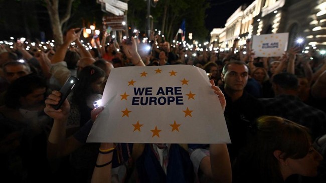 Dalam apa yang disebut sebagai unjuk rasa terbesar dalam beberapa dekade terakhir, sedikitnya 120.000 orang berpartisipasi dalam aksi bernama 'March for Europe' di Tbilisi ini. Angka itu merupakan perkiraan AFP yang didasarkan pada rekaman video yang diambil dari udara dengan drone.