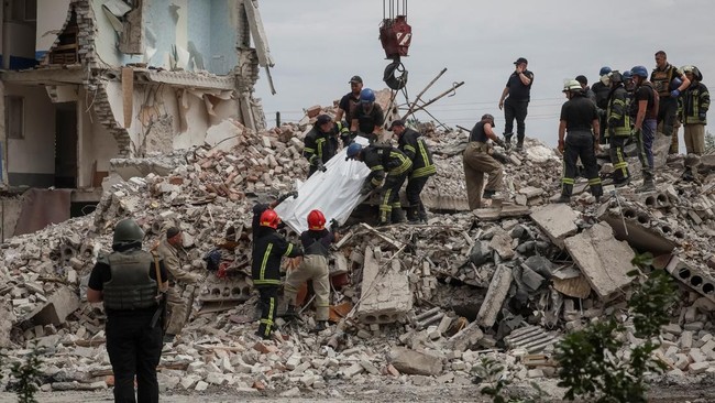 Dilansir dari kantor berita Reuters, Selasa (12/7/2022), tim penyelamat mengangkat seorang warga yang selamat dari reruntuhan dan membawa mayat dua orang dalam kantong jenazah berwarna putih. Para tentara juga membantu upaya penyelamatan di kota Chasiv Yar, provinsi Donetsk pada Senin (11/7) waktu setempat tersebut.