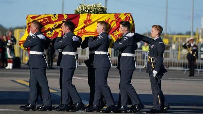 Pesawat Royal Air Force (RAF) C-17 yang membawa jenazah Ratu Elizabeth II telah tiba di London, Inggris. Jenazah ratu yang meninggal pada usia 96 tahun itu mendarat di RAF Northolt, sebelah barat London, usai menempuh penerbangan lebih dari satu jam dari Bandara Edinburgh, Skotlandia.