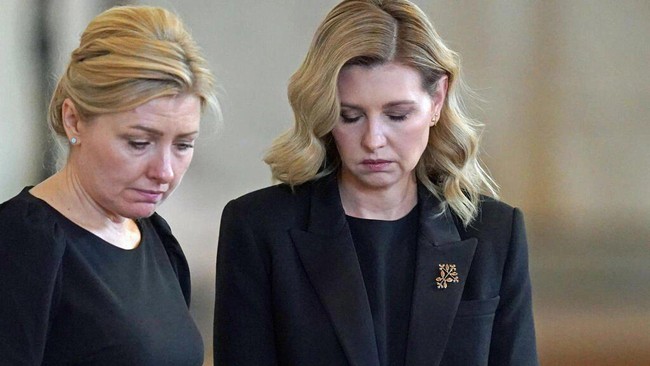 Raut wajah Zelenska menunjukkan kesedihan saat dia melihat langsung peti jenazah Ratu Elizabeth II, dengan didampingi Perdana Menteri (PM) Denys Shmygal dan Duta Besar Ukraina untuk Inggris, Vadym Prsytaiko.