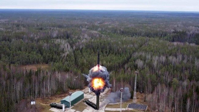 Militer Rusia menggelar simulasi 'serangan nuklir besar-besaran'. Latihan itu diawasi oleh Presiden Rusia Vladimir Putin dari ruang kendali.