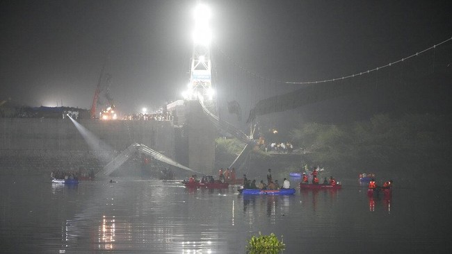 Jembatan gantung di India ambruk pada Minggu (30/20/2022). Akibat peristiwa tersebut, ratusan orang jatuh ke Sungai Machchu. Seratusan orang meninggal dan puluhan lainnya terluka. Hingga kini, tim tengah melakukan pencarian korban hilang.
