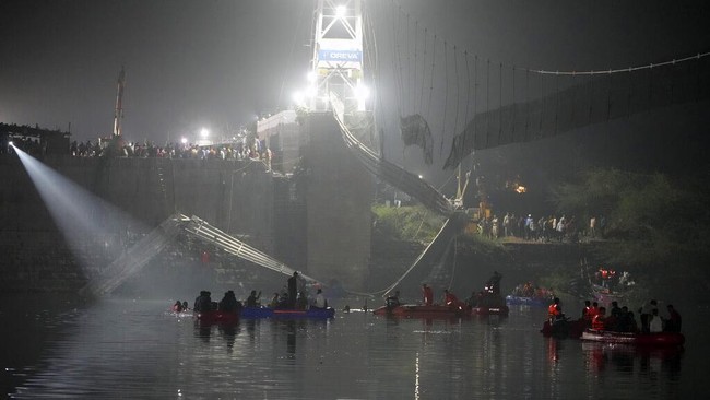Jembatan gantung tersebut, yang telah dibuka kembali beberapa hari sebelumnya setelah renovasi, ambruk pada Minggu (30/10) malam waktu setempat, menyebabkan ratusan orang jatuh ke sungai di tengah gelapnya malam.