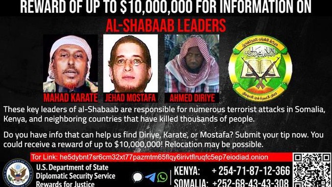 AS menyatakan pihaknya menawarkan imbalan masing-masing sebesar US$ 10 juta untuk informasi yang mengarah pada identifikasi 'emir' Ahmed Diriye, komandan kedua Mahad Karate dan Jehad Mostafa, yang seorang warga negara AS yang diduga memiliki banyak peran dalam kelompok militer itu.