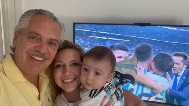 Presiden Argentina, Alberto Fernandez mengunggah foto Selfie bersama sang istri Fabiola Yanez dan anaknya. Mereka foto selfie di depan layar TV yang sedang menampilkan para pemain Argentina saling berpelukan usai menjadi juara Piala Dunia 2022.