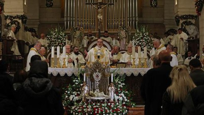 Patriark Latin Yerusalem, Pierbattista Pizzaballa, menyambut para jemaah setibanya di kota itu, sebelum memimpin prosesi malam Natal tahunan di Gereja Kelahiran Yesus.