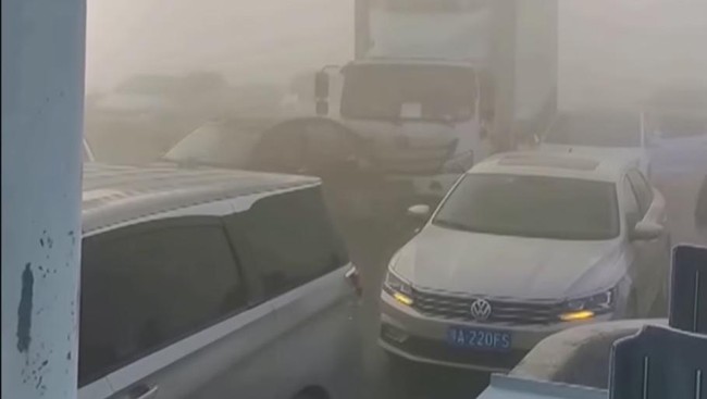 Sebuah gambar menunjukkan mobil penumpang, van dan truk, dan kendaraan lainnya telah menabrak satu sama lain menumpuk di satu bagian jalan raya. Penyebab tabrakan beruntun di China itu adalah kabut tebal.