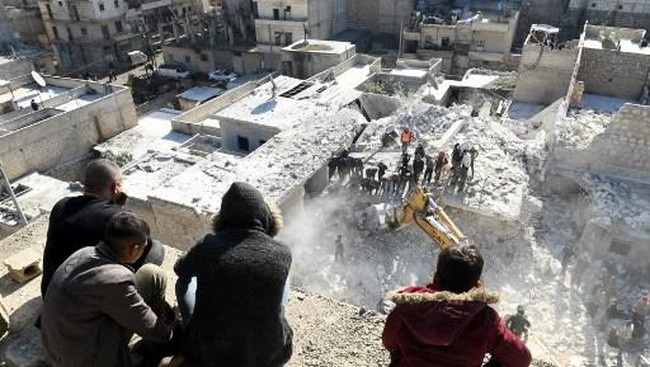 Bangunan yang rusak karena perang di Aleppo, Suriah, ambruk. Akibatnaya, 16 orang termasuk anak-anak tewas dalam peristiwa tersebut.