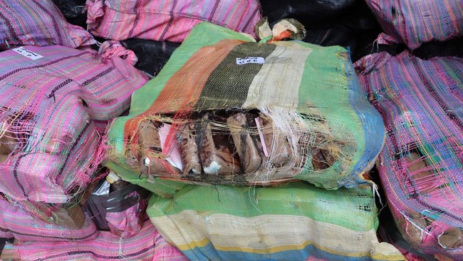 Sebuah foto yang dirilis kepolisian menunjukkan hasil temuan itu, tampaknya diambil sebelum penyitaan, saat masih berada di dalam jaring yang ditopang beberapa pelampung di permukaan laut.