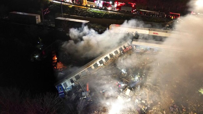 Tabrakan maut 2 kereta di Kota Larissa, Yunani menewaskan 57 orang. Kepala stasiun setempat ditangkap buntut adu banteng 2 kereta api tersebut.