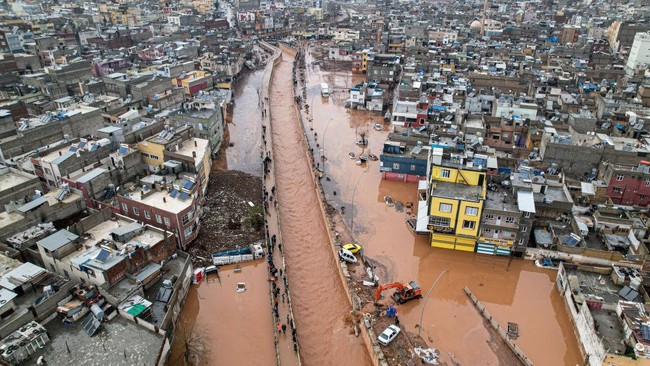 Tayangan televisi dari Sanliurfa menunjukkan air banjir melonjak di sepanjang jalan dan menyapu mobil serta puing-puing. Tim penyelamat dengan menggunakan tali, terlihat mengangkat seorang pria ke tempat aman dari underpass yang tergenang air.