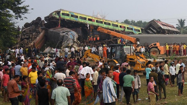 Tabrakan maut itu berlangsung di distrik Balasore, Odisha, Jumat (2/6/2023) sekitar pukul 19.00 waktu setempat. Banyak penumpang terjebak di gerbong kereta tersebut.