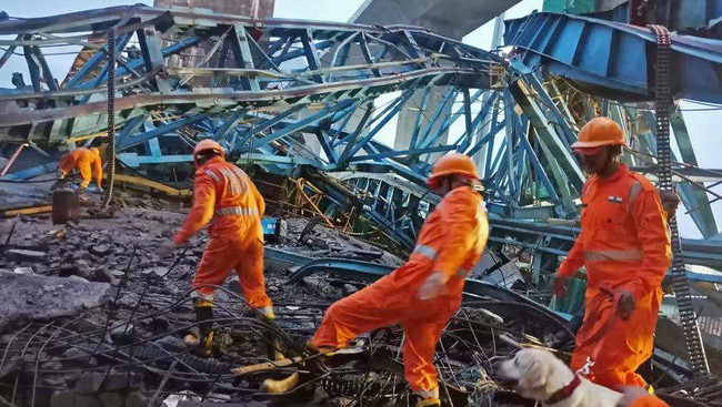 Sebuah video yang dirilis NRDF menunjukkan para petugas penyelamat memeriksa tumpukan balok baja yang hancur di lokasi proyek yang ada di area Thane, pinggiran kota Mumbai.