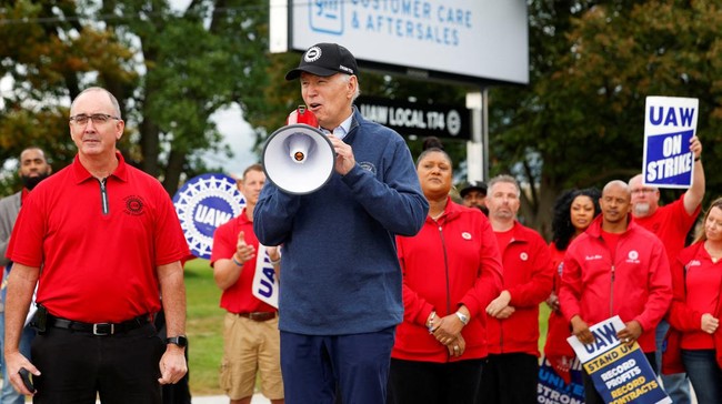 Dilansir AFP, Kamis (27/9/2023), Biden bergabung dengan para pekerja otomotif yang sedang berunjuk rasa di Michigan untuk memperjuangkan gaji dan kondisi kerja yang lebih baik. Biden yang mengenakan topi bertuliskan United Auto Workers (UAW) berdiri di sebelah para pekerja otomotif yang berunjuk rasa di Michigan pada Selasa (26/9) waktu setempat.