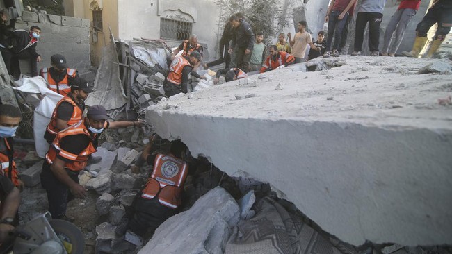 Dilansir Al Jazeera, Senin (16/10/2023), tim pertahanan sipil Palestina dalam pernyataannya menyebut ada yang terluka dan tewas di antara lebih dari 1.000 orang yang diduga tertimbun reruntuhan.
