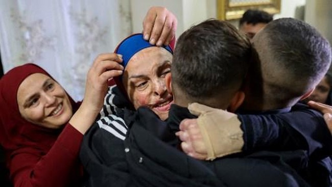 "Saya malu untuk membicarakan kegembiraan ketika seluruh Palestina terluka", kata Jaabis usai tiba di rumahnya. Jaabis terlihat memeluk putranya yang berusia 13 tahun.