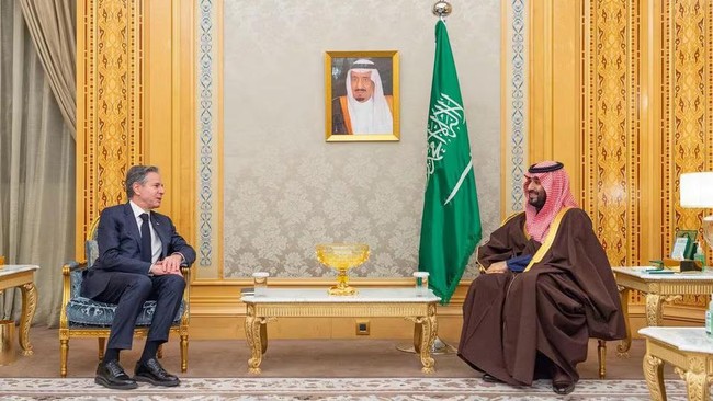 Menteri Luar Negeri Amerika Serikat (AS) Antony Blinken bertemu dengan Putra Mahkota Kerajaan Arab Saudi, Pangeran Mohammed bin Salman (MBS) di Riyadh. Keduanya membahas terkait serangan Israel ke Gaza, Palestina.